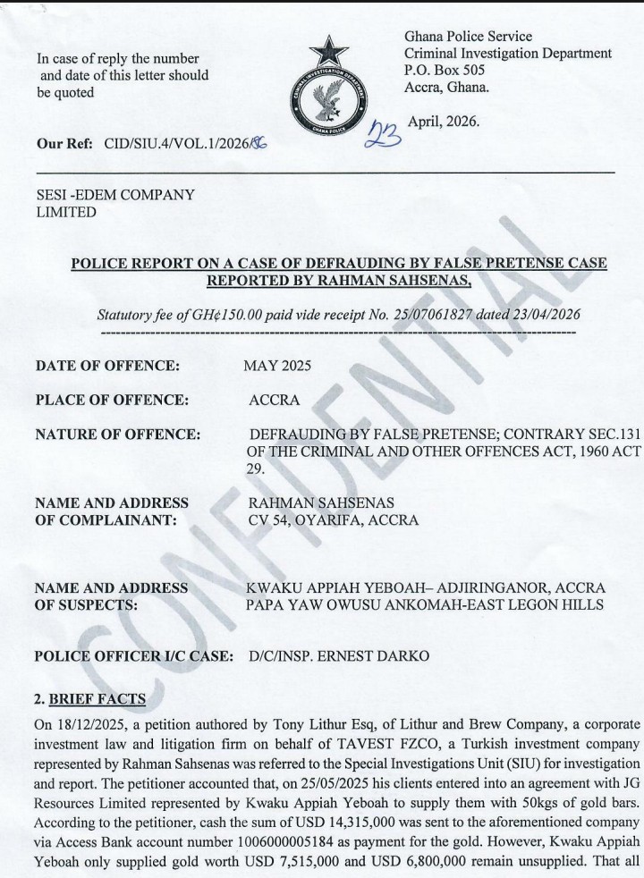 A report by the Criminal Investigations Department (CID) of the Ghana Police Service has exonerated Sesi-Edem Company Limited and its directors, including Dr Gabriel Tanko Kwamigah-Atokple, of any criminal wrongdoing in connection with a disputed $14.315 million gold transaction.