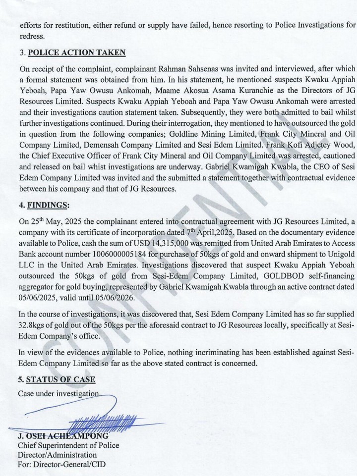 CID findings indicate that JG Resources Limited later entered into a contract with Sesi-Edem Company Limited on June 5, 2025, for the supply of 50 kilograms of gold, with the agreement set to run until June 5, 2026.