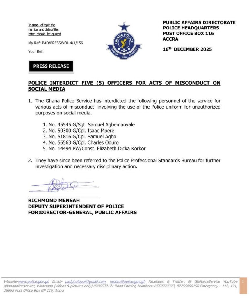 A release signed by DSP Richomd Mensah, on behalf of the Director General, for Public Affairs said the officers used the Police uniform to do what is not permitted by the Service online.