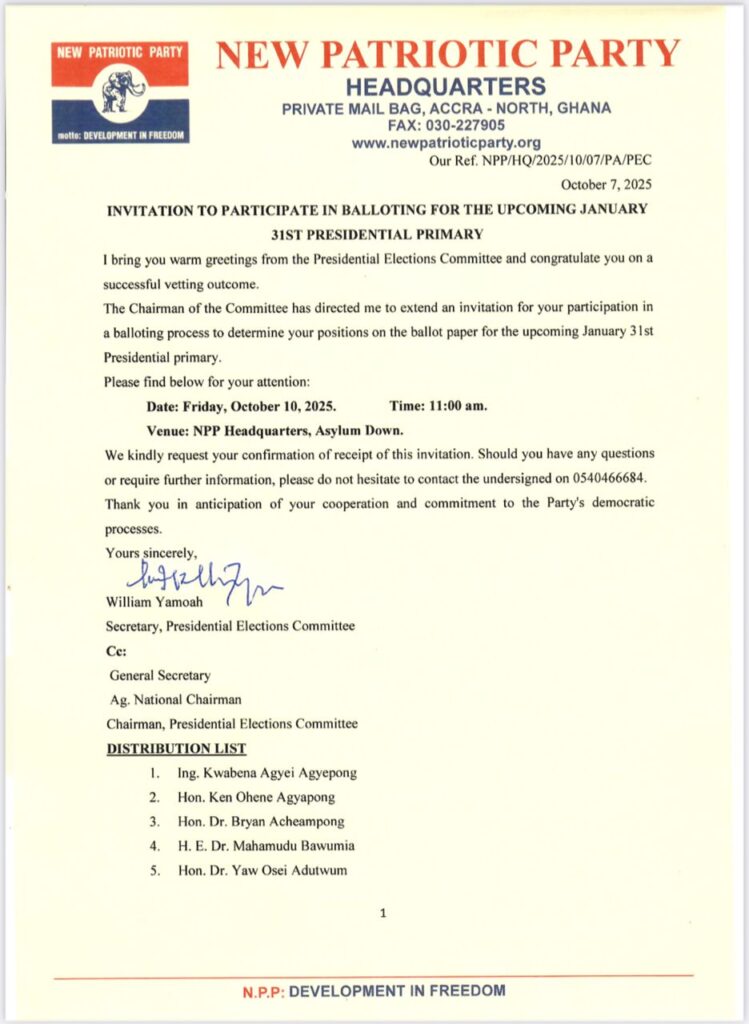 The New Patriotic Party (NPP) has scheduled a balloting exercise for its presidential aspirants ahead of the party’s January 31, 2026, presidential primary.